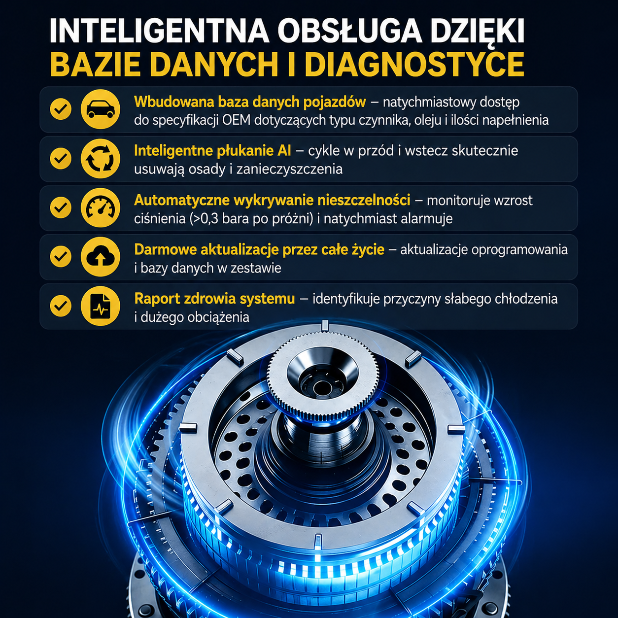 - Zintegrowana baza danych: Posiada wbudowaną bazę danych pojazdów, która automatycznie dopasowuje odpowiednią ilość czynnika i oleju do konkretnego modelu auta.