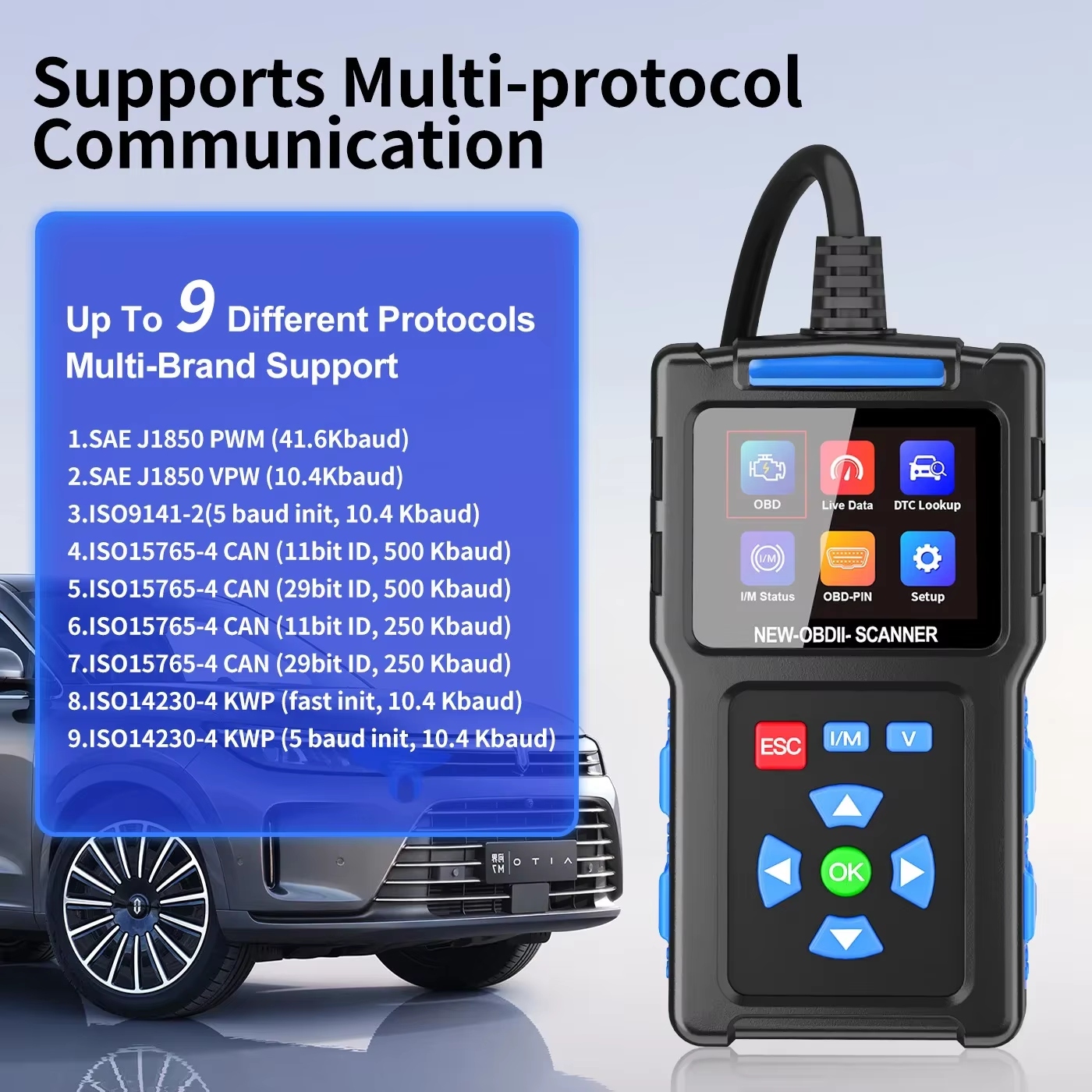 - Odczyt i kasowanie błędów OBD-II: P0, P2, P3, U0, oraz kody charakterystyczne danej marki: P1, P3, U1